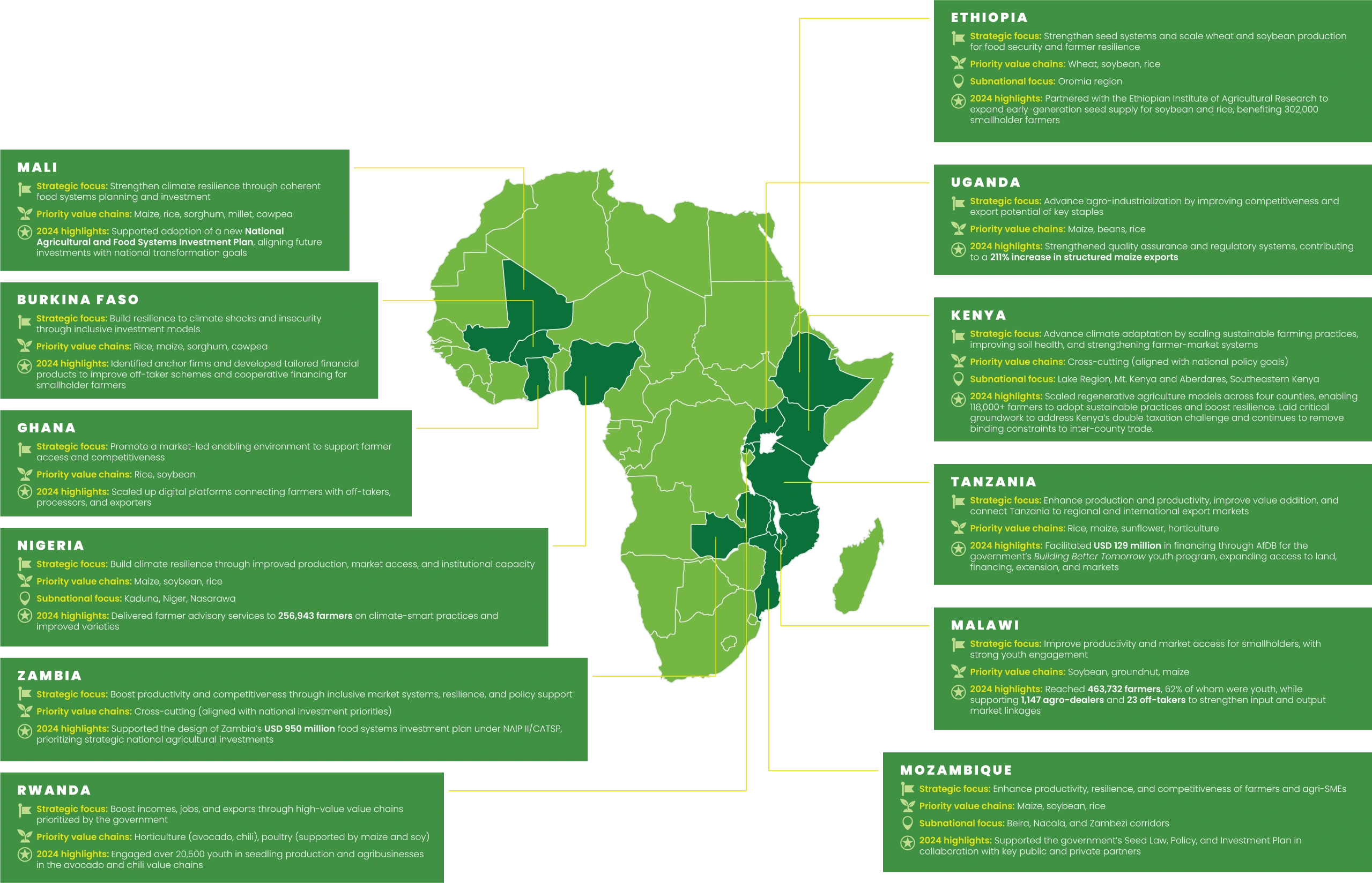 In 2024, AGRA supported country-led agricultural transformation by aligning its investments with national, regional, and continental priorities. This infographic highlights AGRA’s 12 focus countries, outlining the strategic areas of work and priority value chains in each. It also showcases one result from 2024 in each country, reflecting efforts to build resilience and strengthen market competitiveness as part of AGRA’s integrated approach under Strategy 3.0.