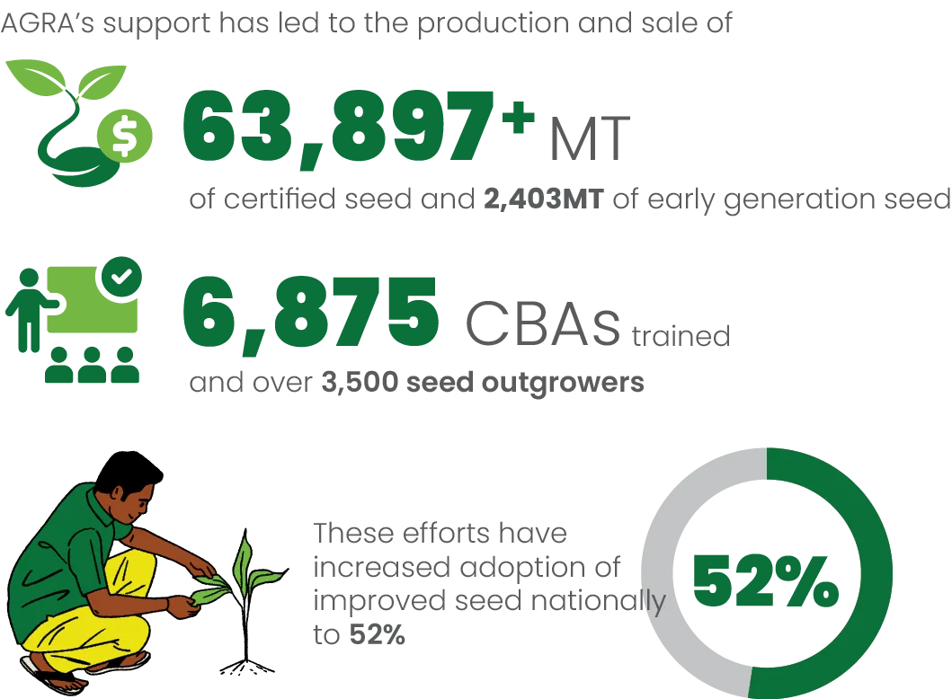AGRA’s support has led to the production and sale of over 63,897MT of certified seed and 2,403MT of early generation seed, while training 6,875 CBAs and over 3,500 seed outgrowers. These efforts have increased adoption of improved seed to 52% nationally, boosted the capacity of seed companies by 30%, and helped farmers like Amina break the cycle of low yields and low incomes.