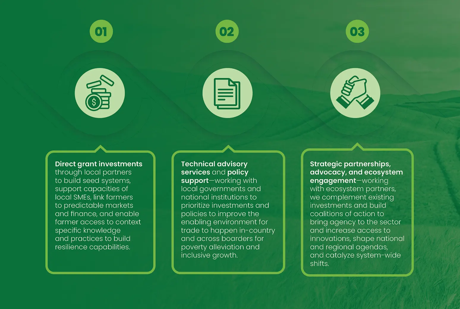 Climate action, youth and gender inclusion, and nutrition are embedded across all interventions to ensure holistic, lasting impact. This approach recognizes that women, youth, and other underrepresented groups are not just beneficiaries, but key drivers of agricultural innovation, productivity, and resilience—bringing diverse skills, perspectives, and solutions that strengthen agribusiness and food systems overall.