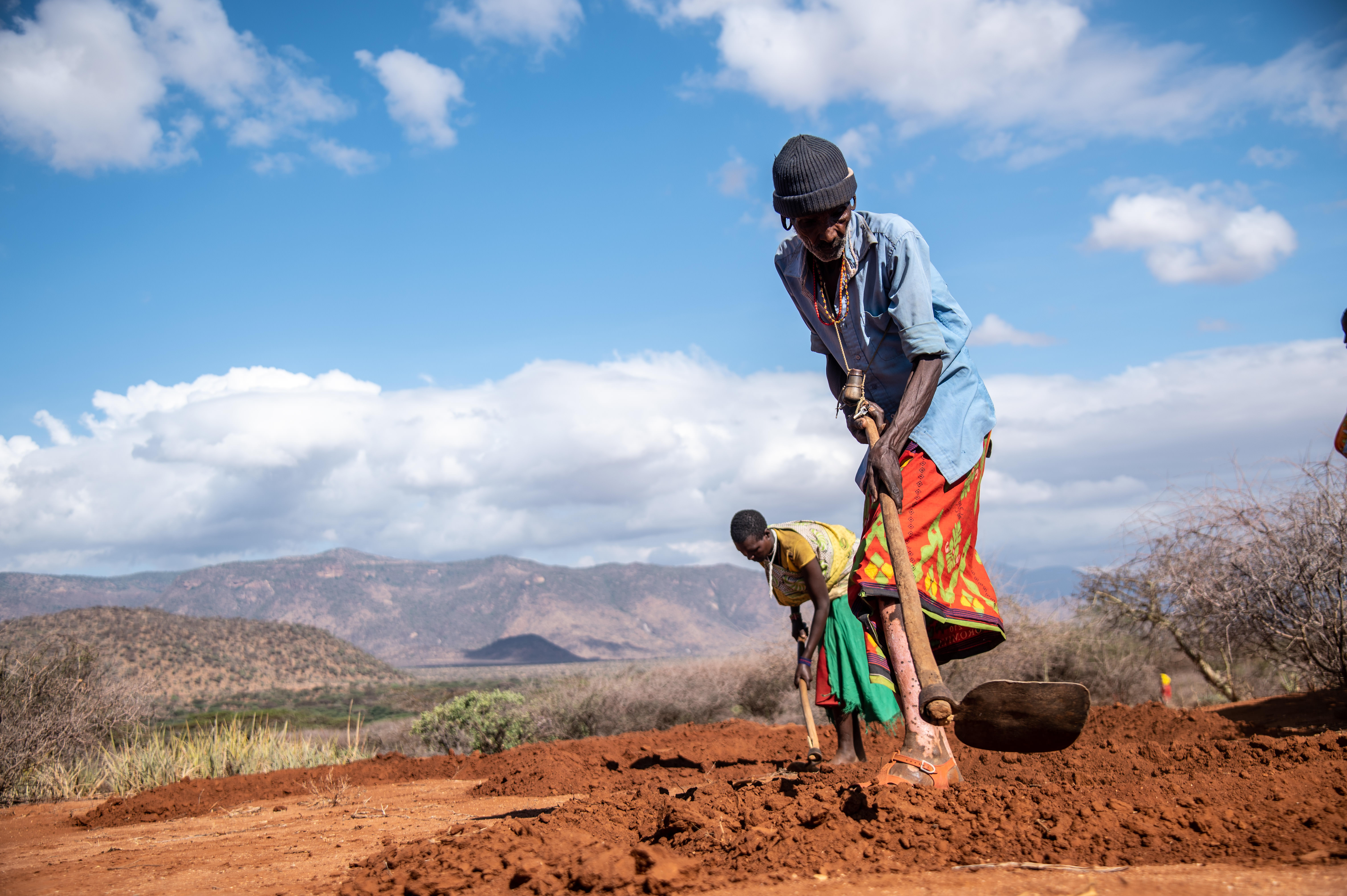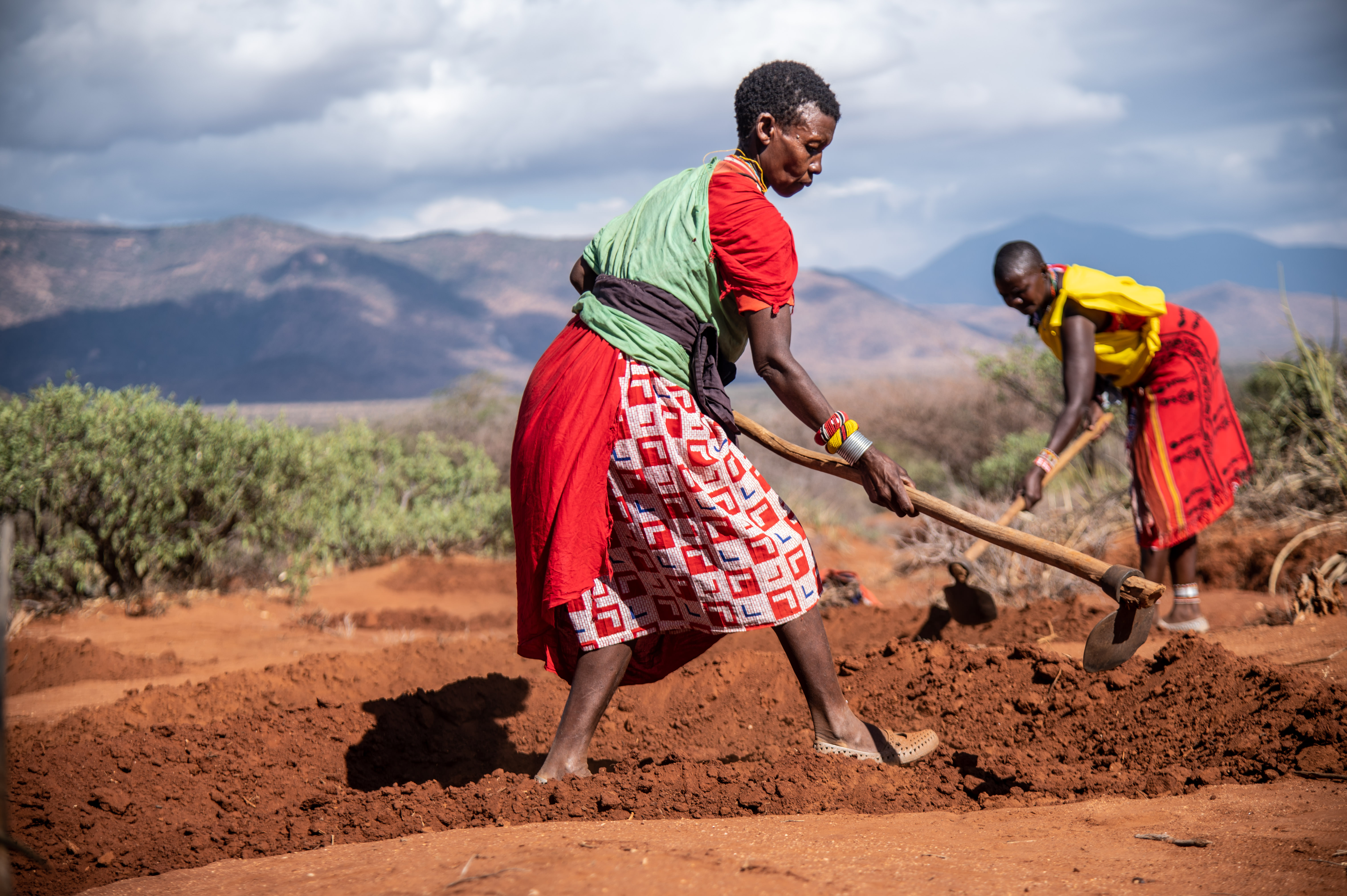 The community in Il Ngwesi, Isiolo County- Kenya engaging in the activity of rangeland restoration through grass reseeding, as part of restoring their degraded landscape.