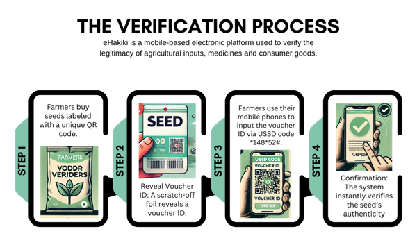 Quincewood’s flagship innovation, the eHakiki Verification System, provides farmers with confidence in the authenticity of seeds through a simple, user-friendly process. When farmers purchase seeds, each package comes with a unique QR code. Beneath a scratch-off foil, a voucher ID is hidden. Farmers can use their mobile phones to input this ID through the USSD code 14852#. Within moments, the system verifies whether the seeds are authentic, offering farmers immediate confirmation and ensuring they plant with confidence.